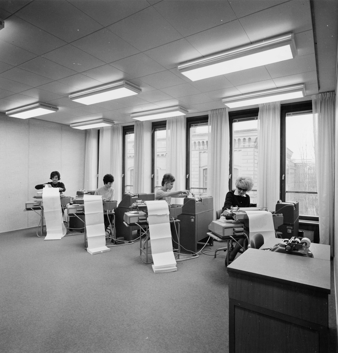 Sparbanksbokföringen i våningen 4 trappor, avdelningen för hålkortstansning. Fönster mot Rådmansgatan