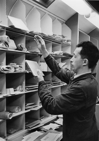 Pkp 310. Kurt Hansson sorterar korsband och långsmala brev.