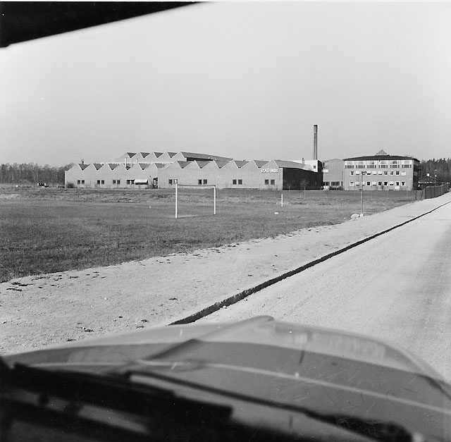Genom postbilens vindruta skymtas Fabriken Stathmos anläggning, där