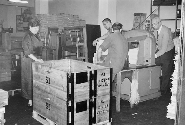 Tidningarna buntas i maskin, varefter de lastas i lådor på pallar,