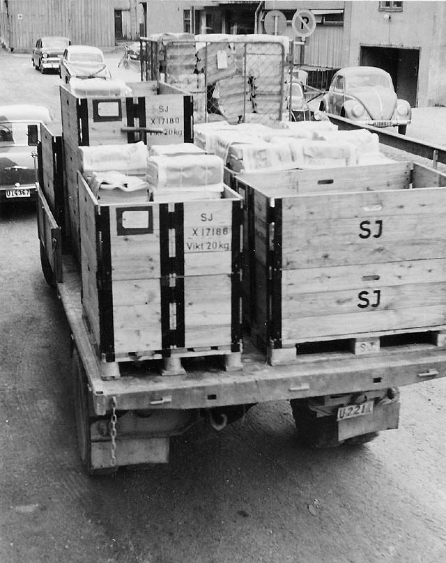 Pallar med tidningsbuntar transporteras per lastbil, från