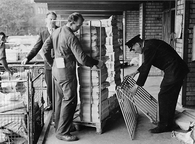 från Grh-vagnen fram till lastbryggan med en av SJ:s gaffeltruckar.