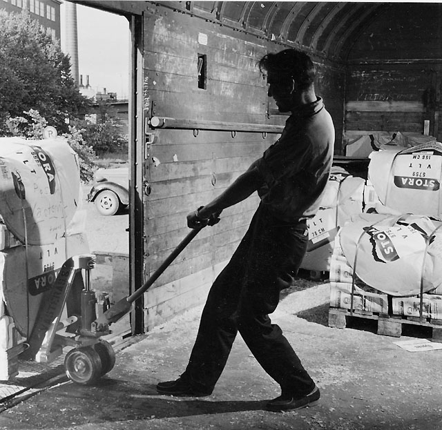 Titel: Inlastning vid järnvägen. Pallasterna har körts med lastbil från ICA-kurirens distributionsavdelning.