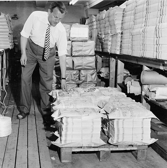 Första lagret buntar lägges på pallen. Pallarna transporteras sedan