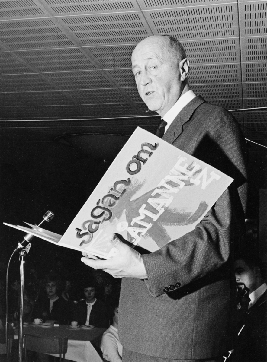 Byrådirektör Carl-Axel Lundin, festens sammanhållande länk, läser "Sagan om Blåmannen", som skrivits av Karin Wollgast-Oly.
