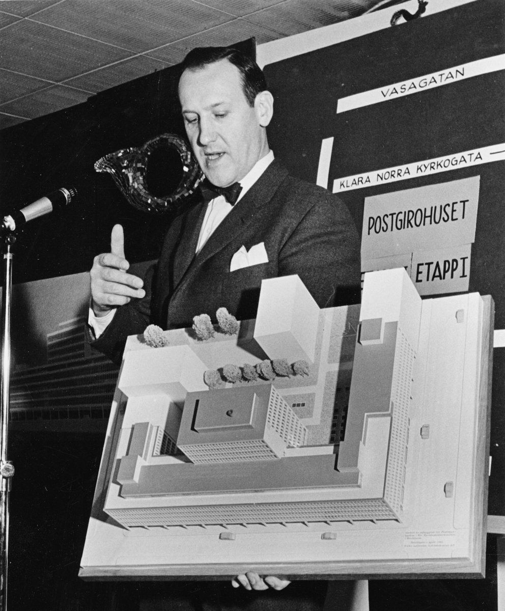 Byrådirektör Tord Hammarberg visar en modell till nya Postbankshuset vid Tegnérlunden och informarar om bygget.
