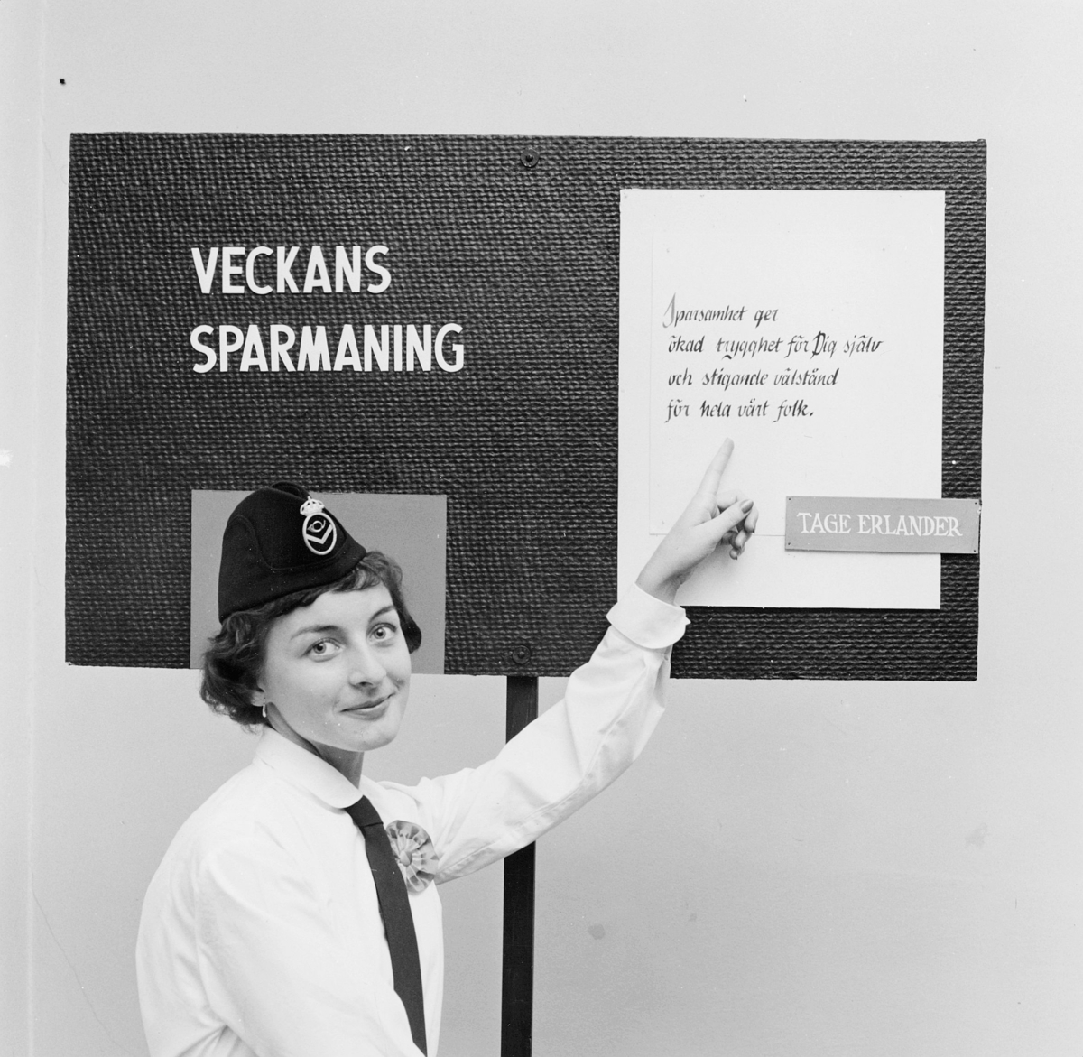 En av utställningens sparvärdinnor visar på veckans sparmaning.