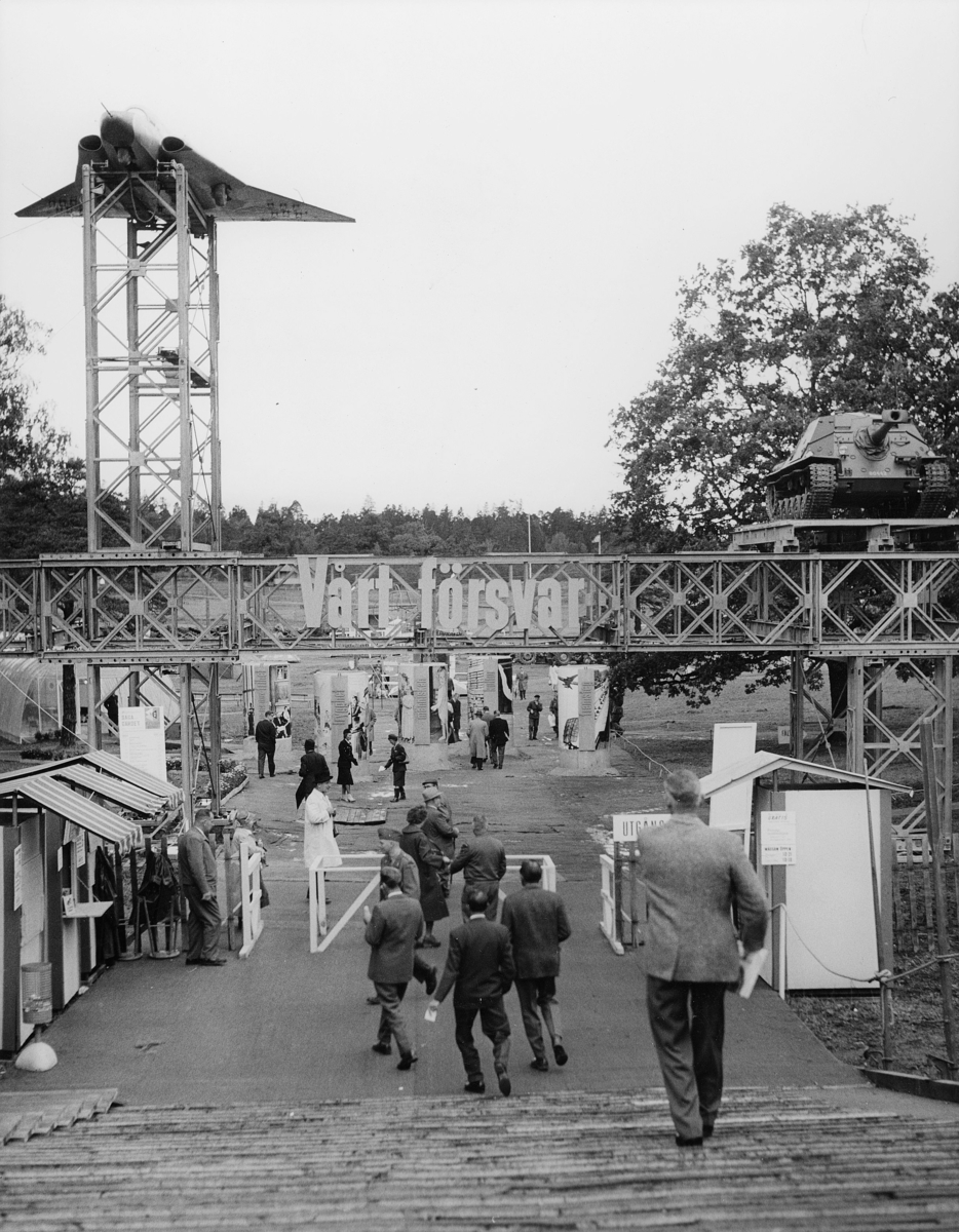 Titel: Drake (flygplanet) och pansarvagn lockade en jämn ström av besökare redan vid utställningsentrén.