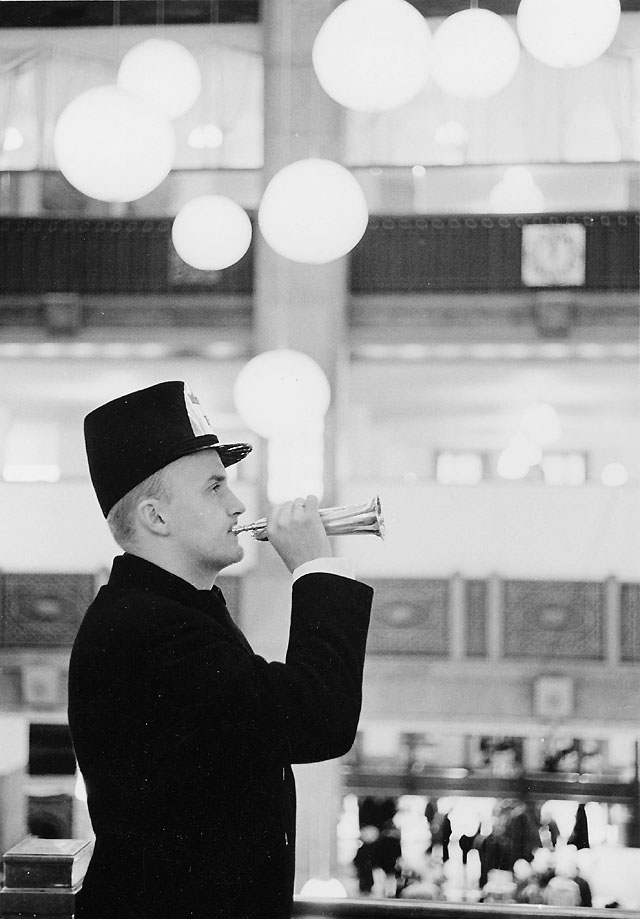 Postiljon Tore Steger tutar i posthornet, på NK.
