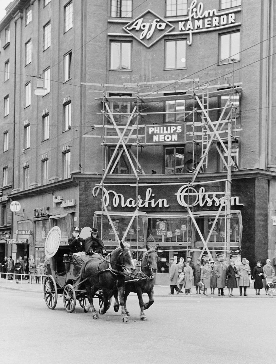 posthornet när diligensen passerar hörnet av Sveavägen och Kungsgatan.