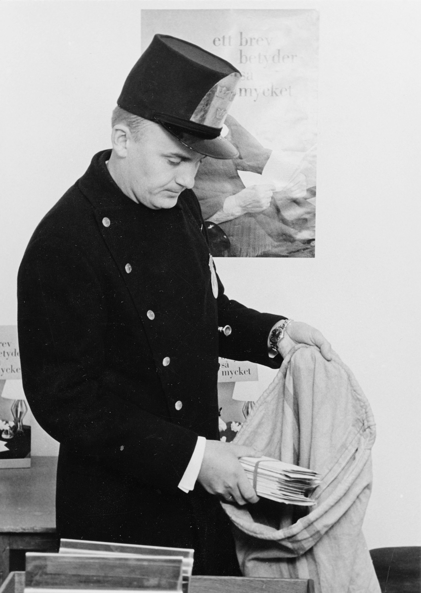 Postiljon Tore Steger hämtar post på utställningen f.v.b. med