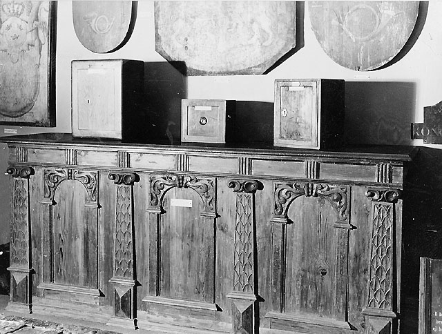 Brevlådor, skyltar och kassakistor, i rum nr 18, på 2 trappor.