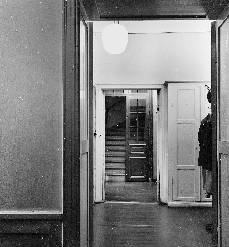 överpostexpeditörens rum, med förstugan i fonden och trappan upp till