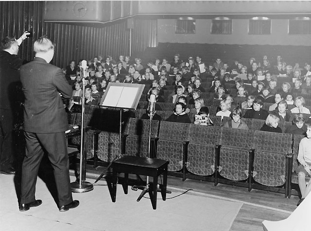 Barnen sjunger "Spargrisvisan". Närmast står Gösta Knutsson.
