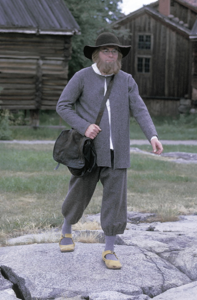 Seriebild M 21. Postbonde från 1600-talet, i kläder från Skansens klädkammare. Statist är Sven-Äke Ohlsson, från Föreningen Postfolkets teatersektion. Den arrangerade bilden är tagen i Skansenmiljö.