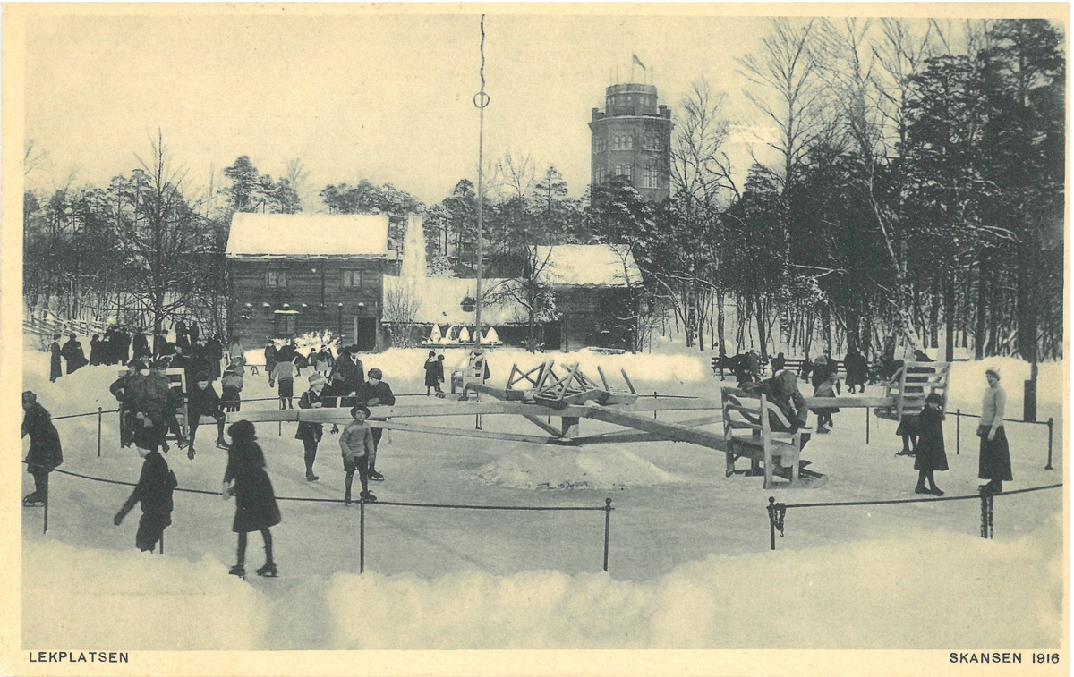 Slängkälke och skridskoåkare på skridskobana "Lekplatsen" framför Kyrkhultsstugan på Skansen.