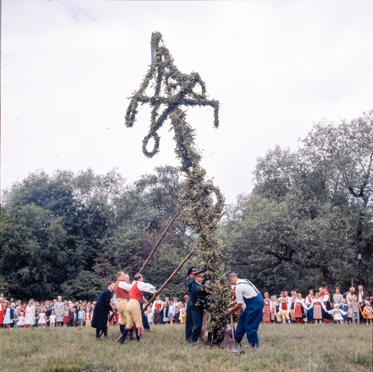 Majstången reses vid midsommarfirandet på Tingsvallen.