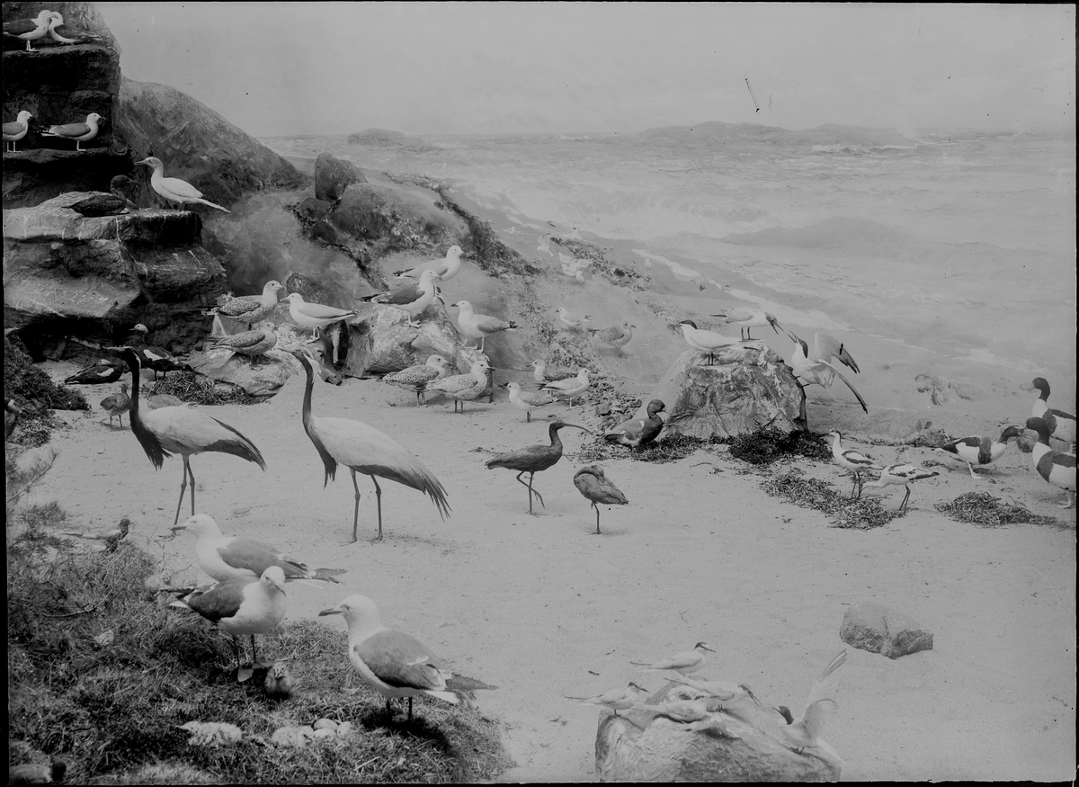 Diorama från Biologiska museets utställning om nordiskt djurliv i havs-, bergs- och skogsmiljö. Fotografi från omkring år 1900.