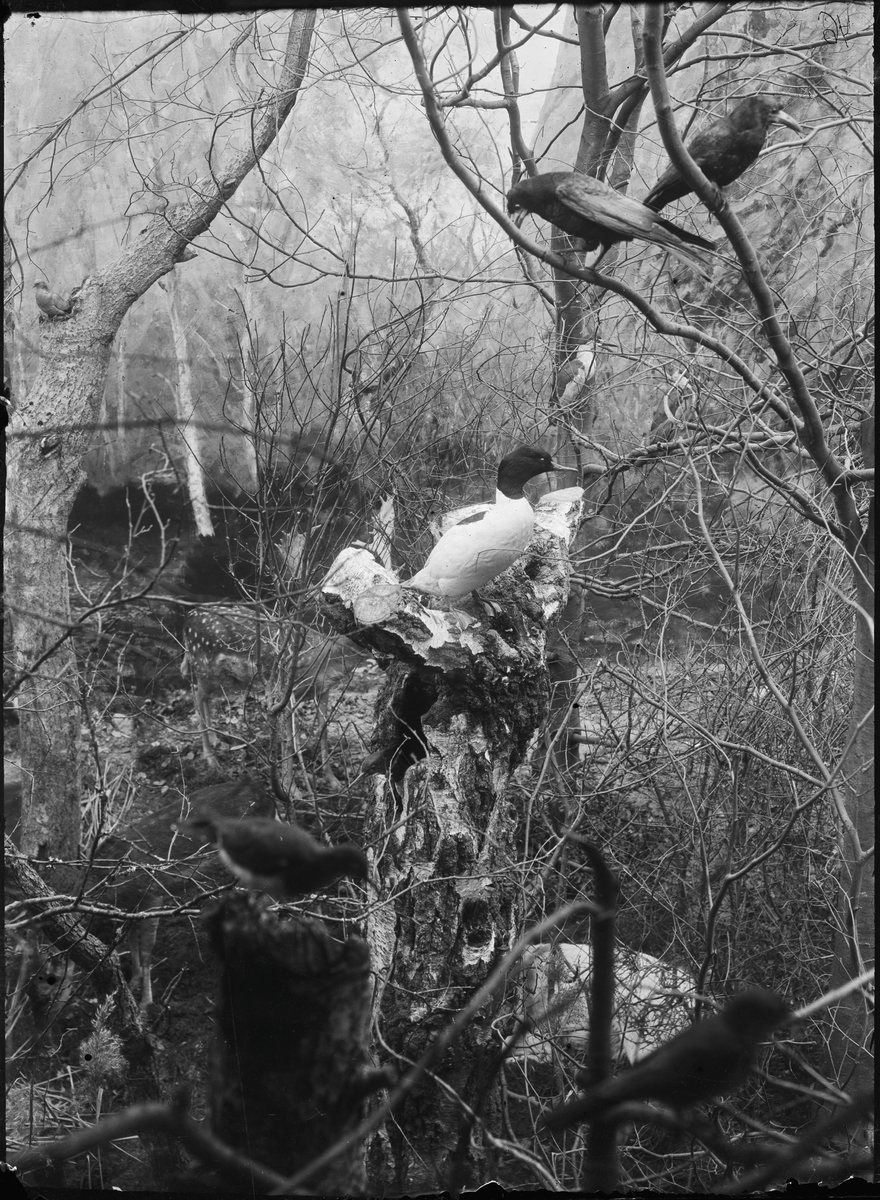 Diorama från Biologiska museets utställning om nordiskt djurliv i havs-, bergs- och skogsmiljö. Fotografi från omkring år 1900.