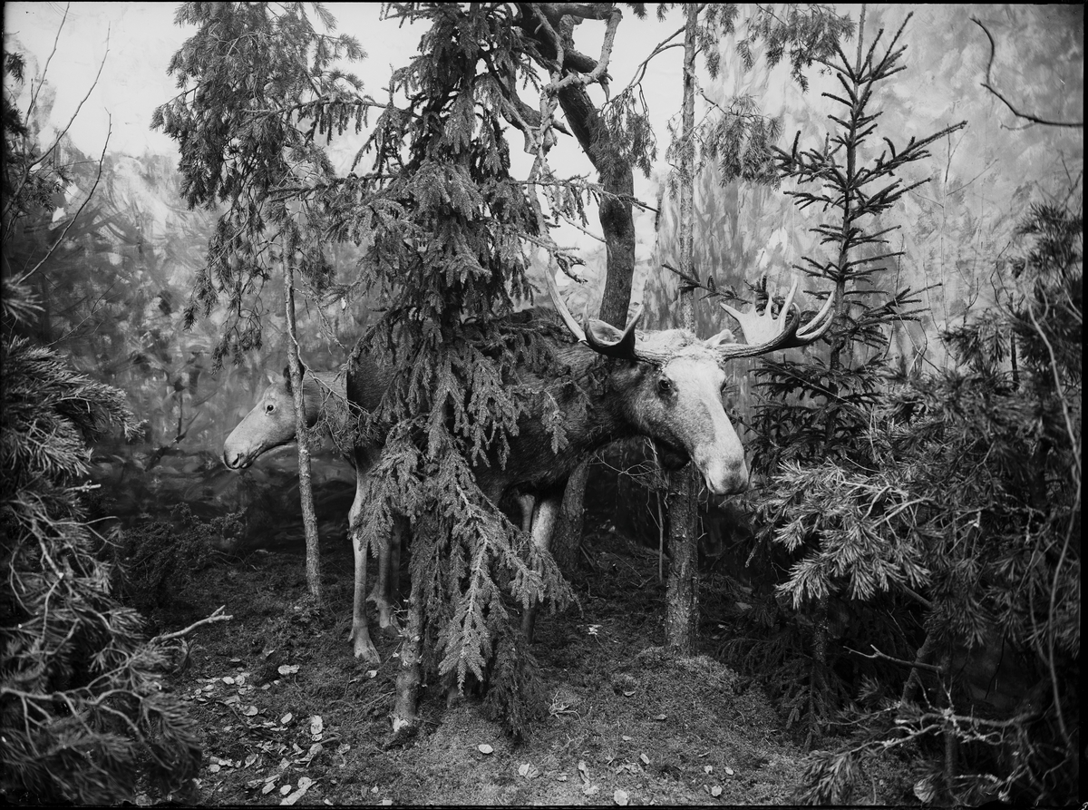 Diorama från Biologiska museets utställning om nordiskt djurliv i havs-, bergs- och skogsmiljö. Fotografi från omkring år 1900.