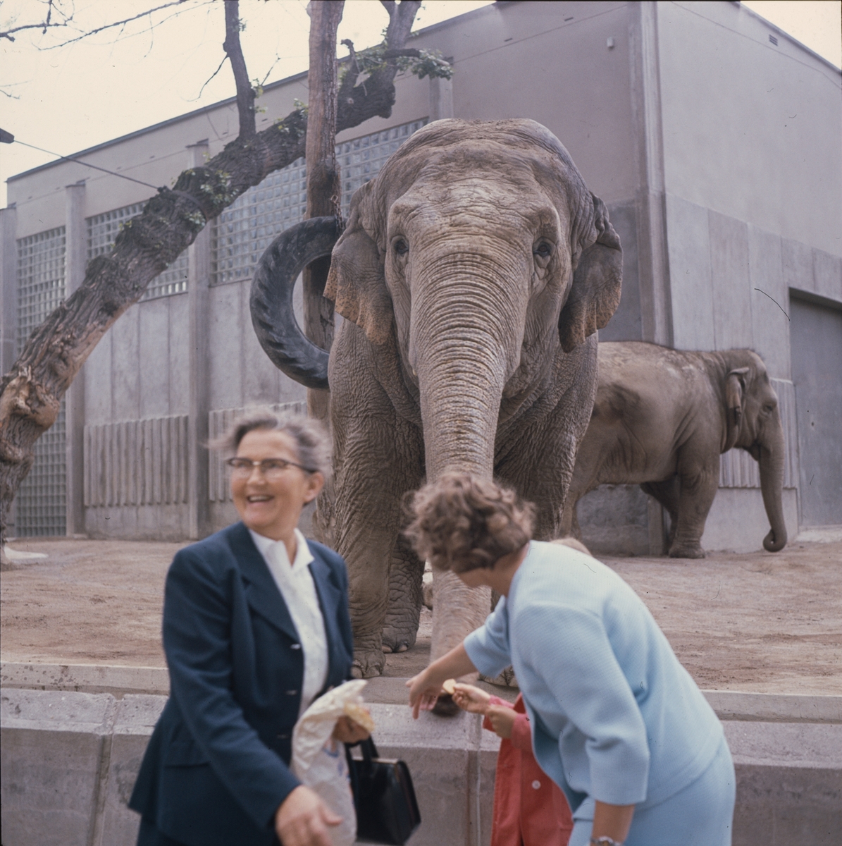 De Asiatiska elefanterna vid elefanthuset på Skansen. Barn och vuxna besökare.