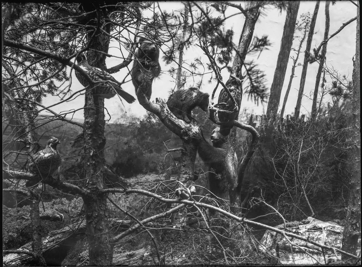 Diorama från Biologiska museets utställning om nordiskt djurliv i havs-, bergs- och skogsmiljö. Fotografi från omkring år 1900.
