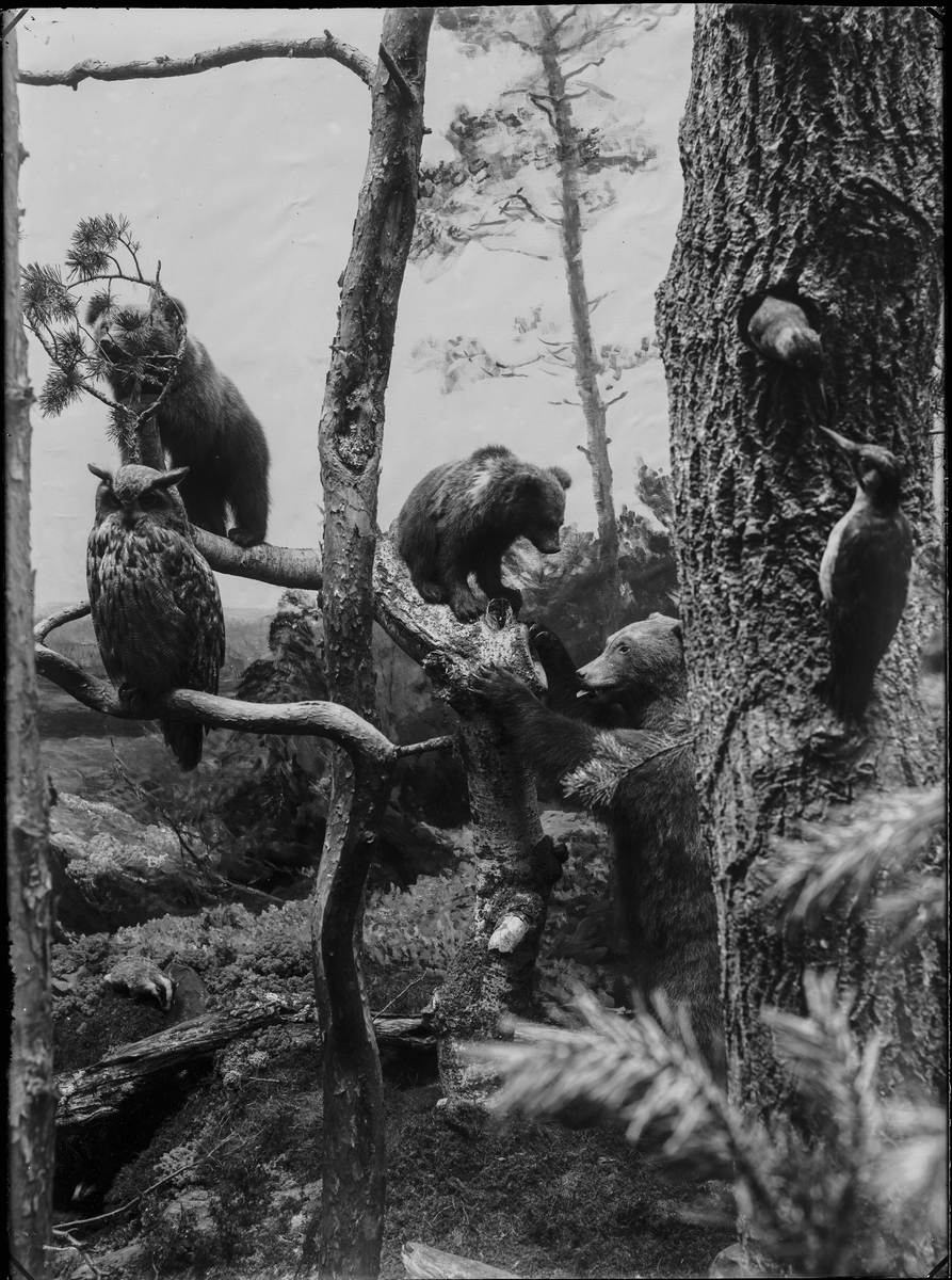 Diorama från Biologiska museets utställning om nordiskt djurliv i havs-, bergs- och skogsmiljö. Fotografi från omkring år 1900.