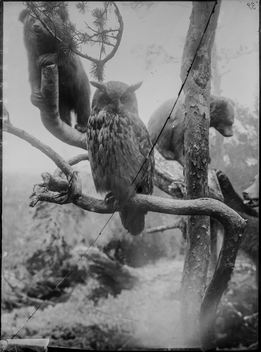 Diorama från Biologiska museets utställning om nordiskt djurliv i havs-, bergs- och skogsmiljö. Fotografi från omkring år 1900.