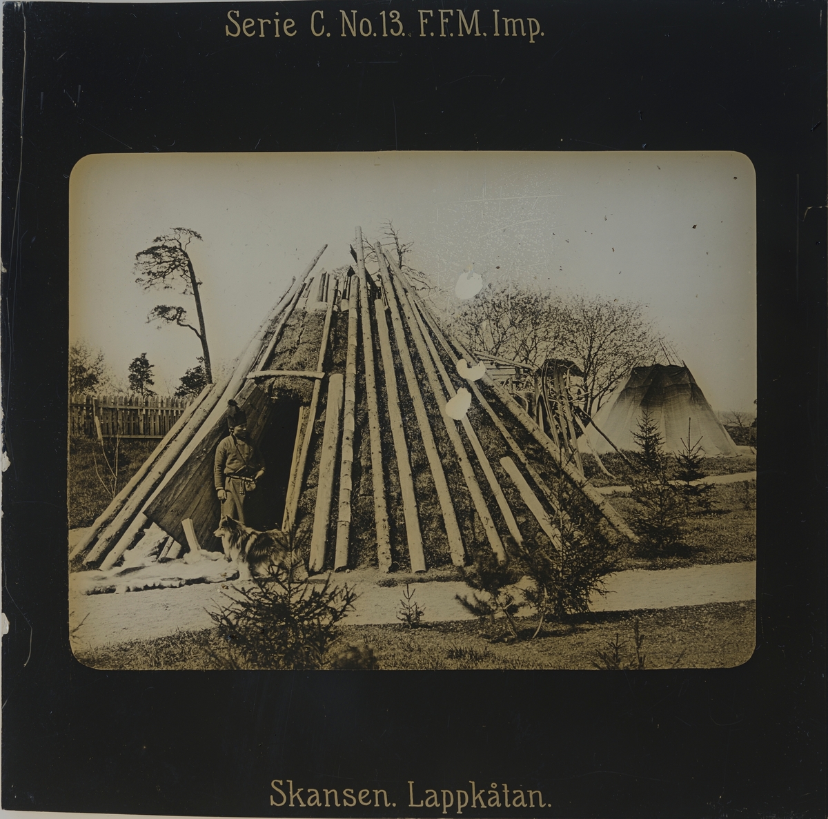 Samevistet, torvkåta. I öppningen till kåtan står en man iklädd samisk dräkt samt en hund.