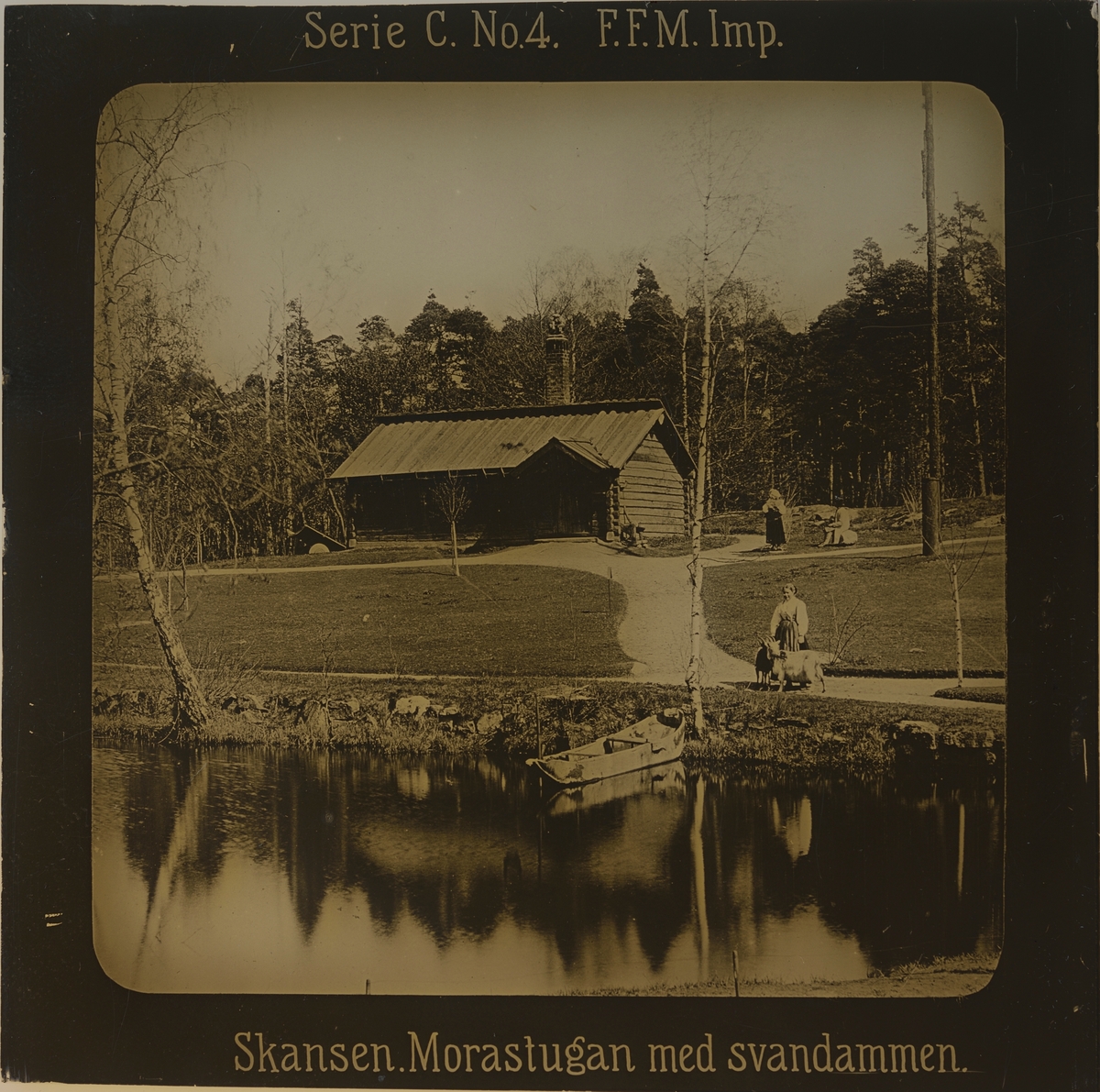 Morastugan på Skansen. I förgrunden svandammen. Personer iklädda folkdräkter samt ett par getter i miljön runt gården.