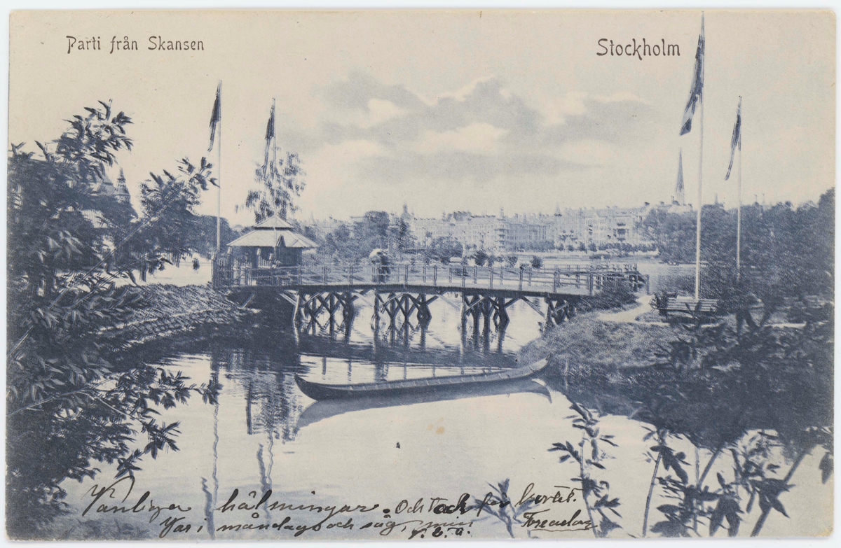Vykort med motiv från Skansen. "Parti från Skansen." Skansens entré nedanför Skånska gruvan. Biljettkontor.