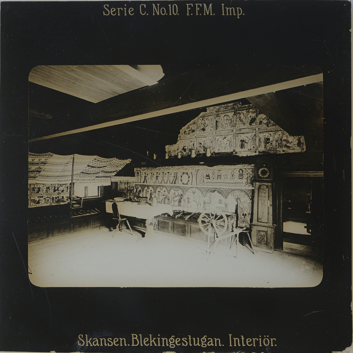 Interiör från Blekingestugan, även kallad Kyrkhultsstugan, på Skansen. På bilden syns målade och vävda bonader på väggarna, ett dukat bord, spinnrock, golvur m.m.