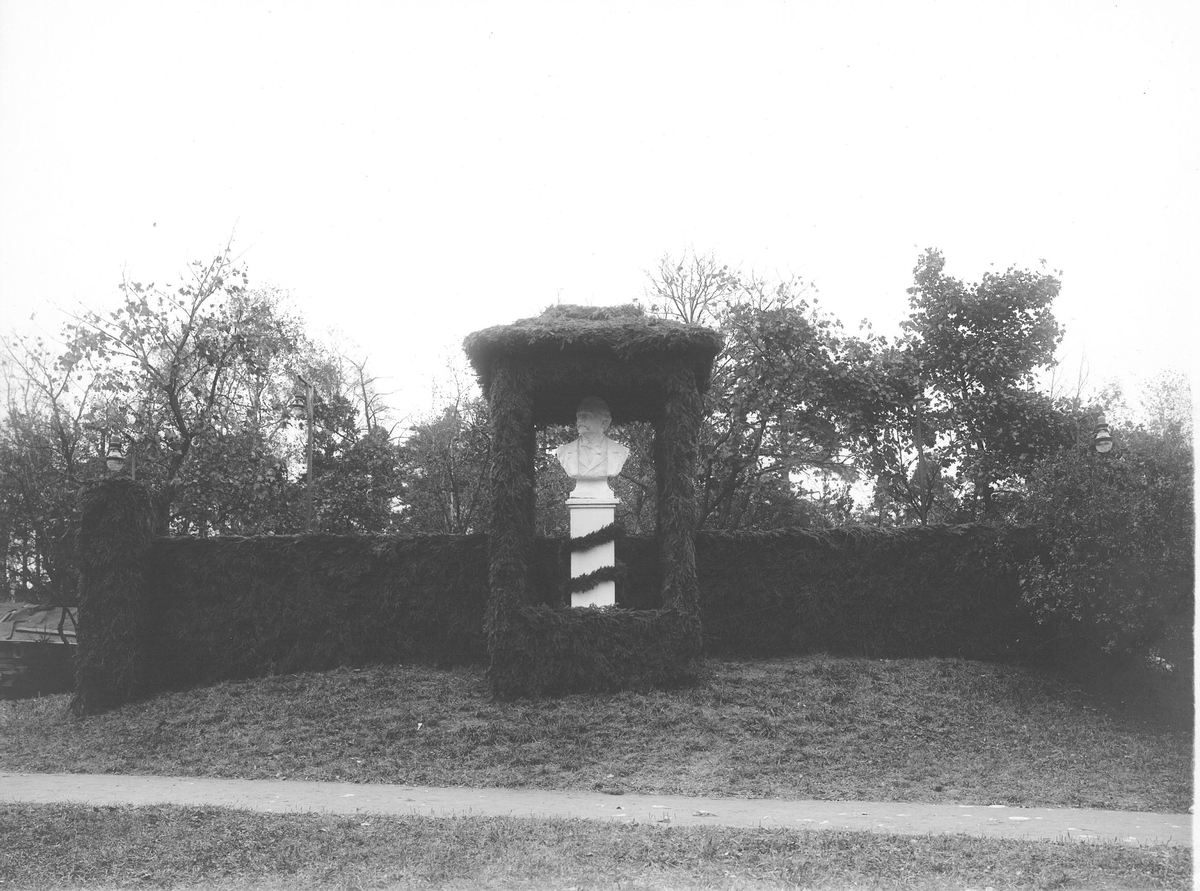 Byst, föreställande Skansens grundare Artur Hazelius, placerad under en takkonstruktion täckt med granris.