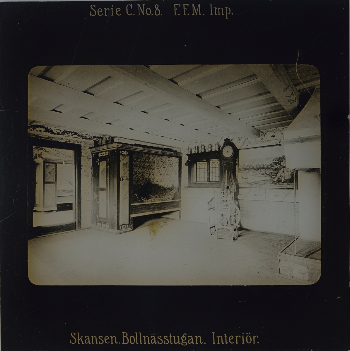 Interiör från Bollnässtugan på Skansen. Säng, golvur m.m.