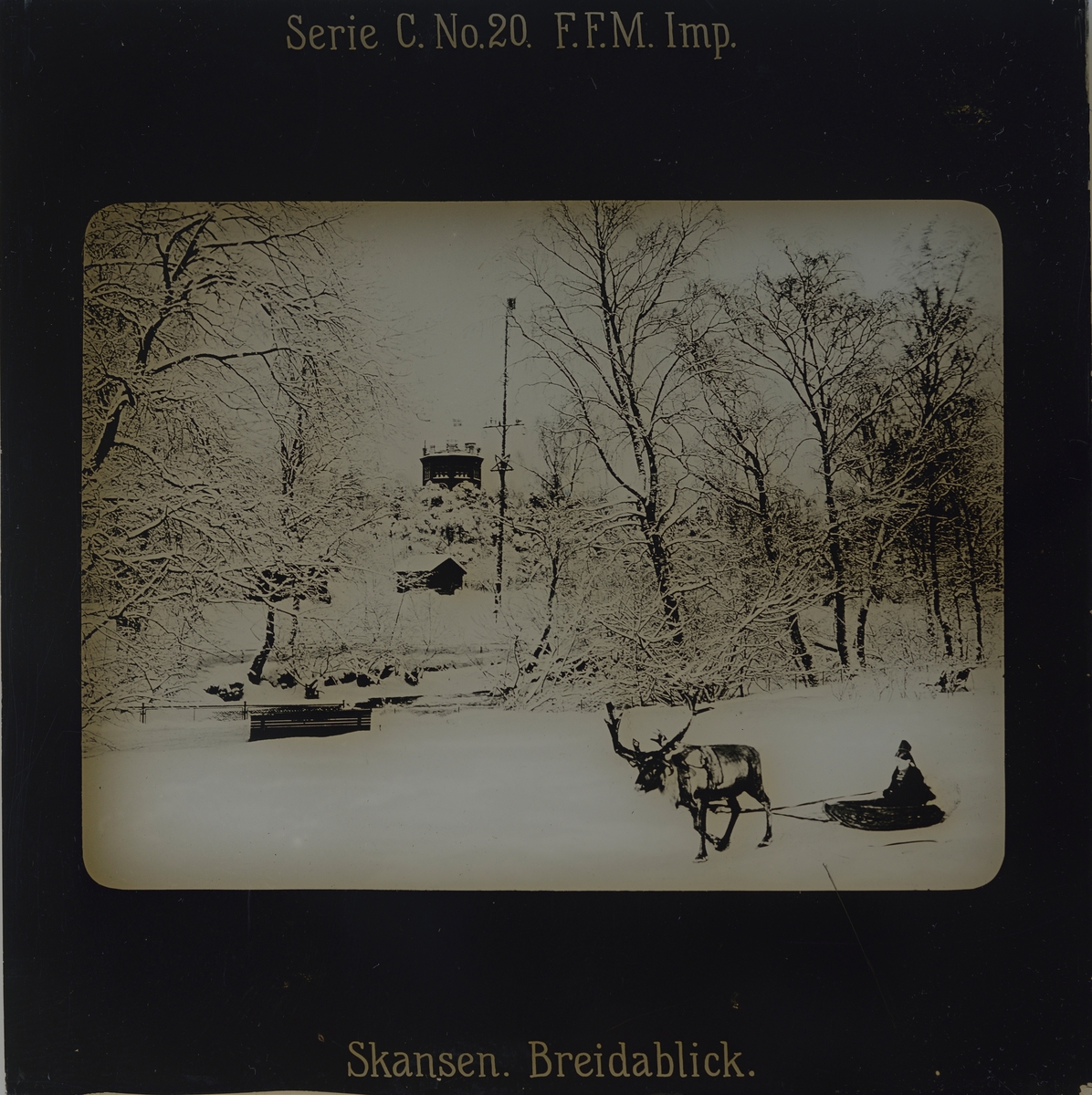 Vintervy från Skansen. I förgrunden en ren som drar en ackja med en kvinna iklädd samisk dräkt, i bakgrunden Bredablick.