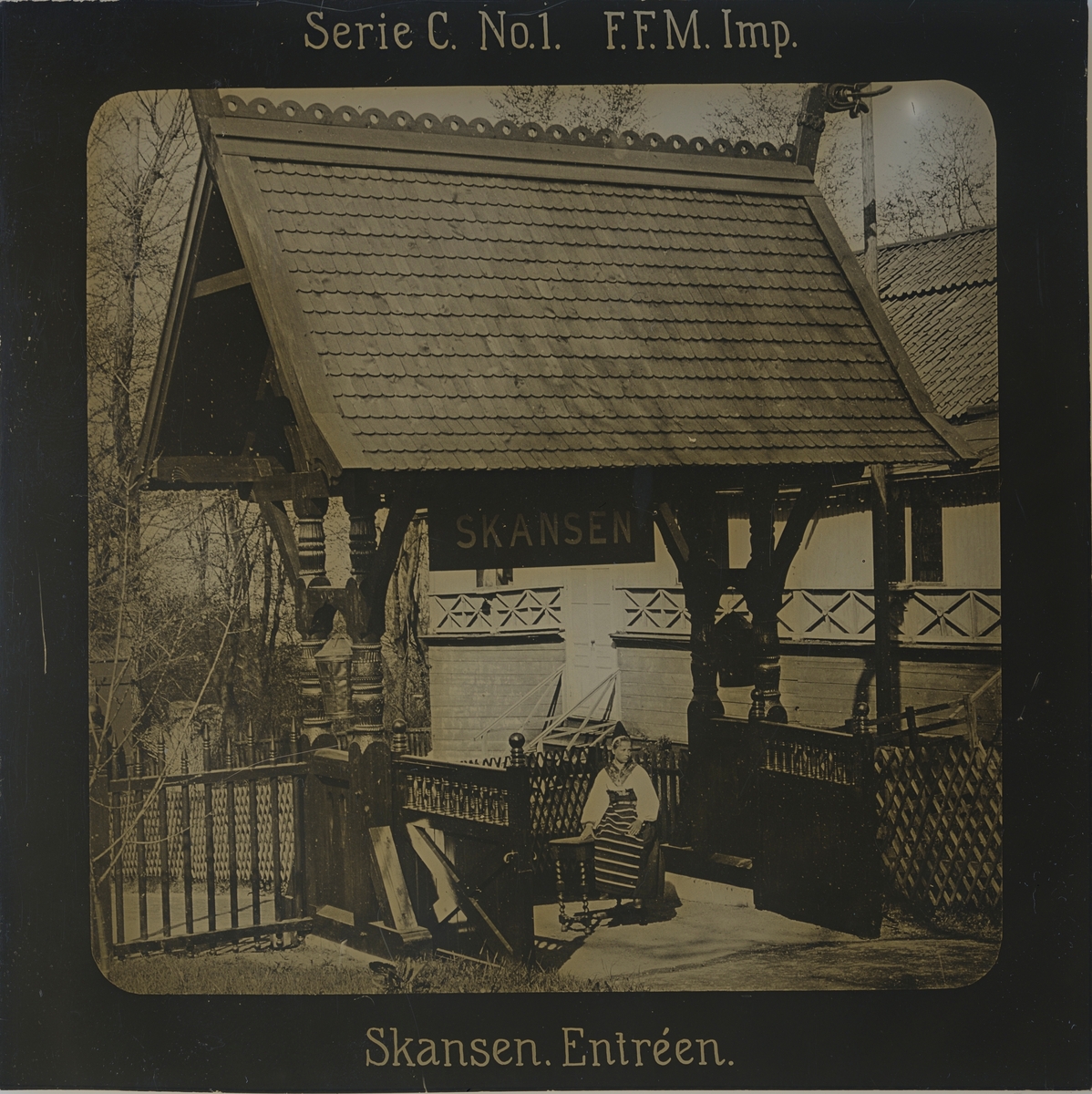 Skansens första entré. I portalen sitter en kvinna iklädd folkdräkt.