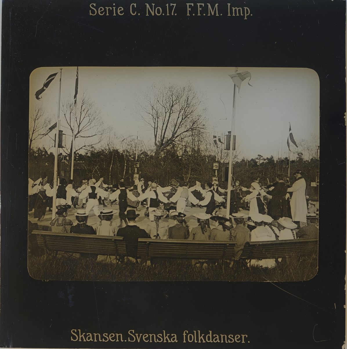 Folkdansuppvisning på Skansen. Publiken sitter på bänkar invid dansbanan.