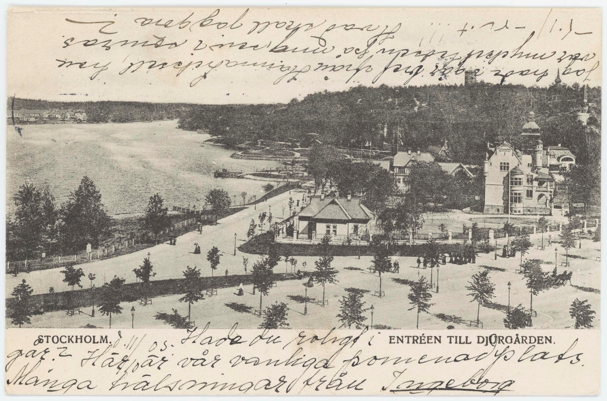 Titel: Vykort med motiv från Skansen. "Entréen till Djurgården." Villa Lusthusporten.