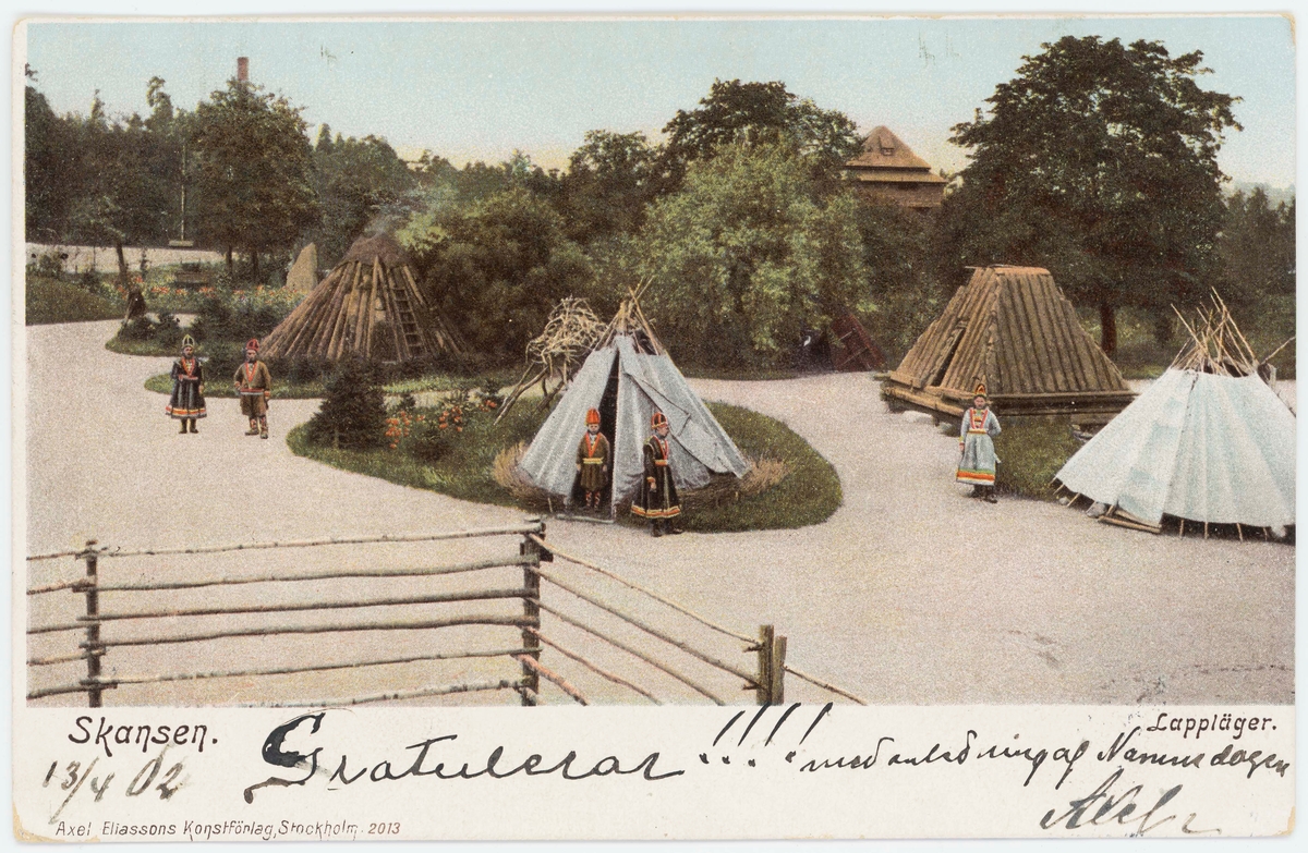 Titel: Vykort med motiv från Skansen. "Lappläger." Det samiska vistet på Skansen.