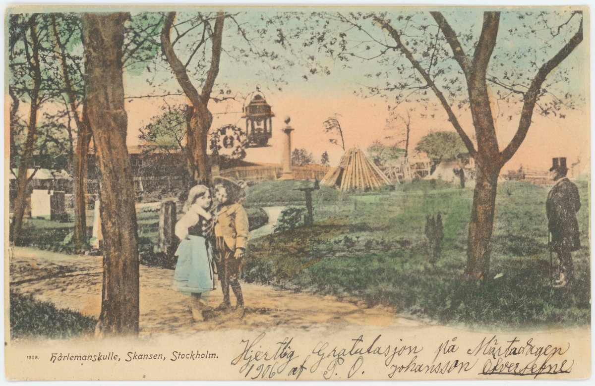 Vykort med motiv från Skansen. "Hårlemans kulle". Torvkåta, skyltar, milstenar, Hårlemans pinne, barn, man i hög hatt m.m.