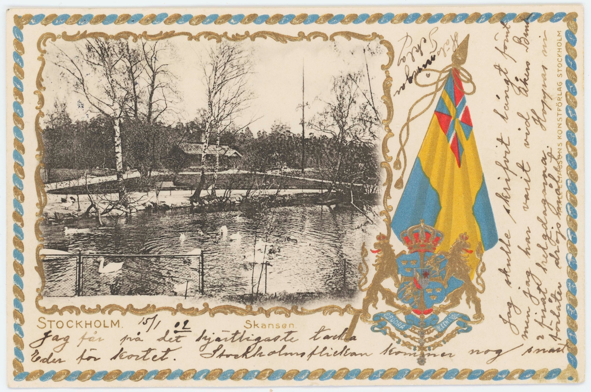 Titel: Vykort med motiv från Skansen. Svandammen.