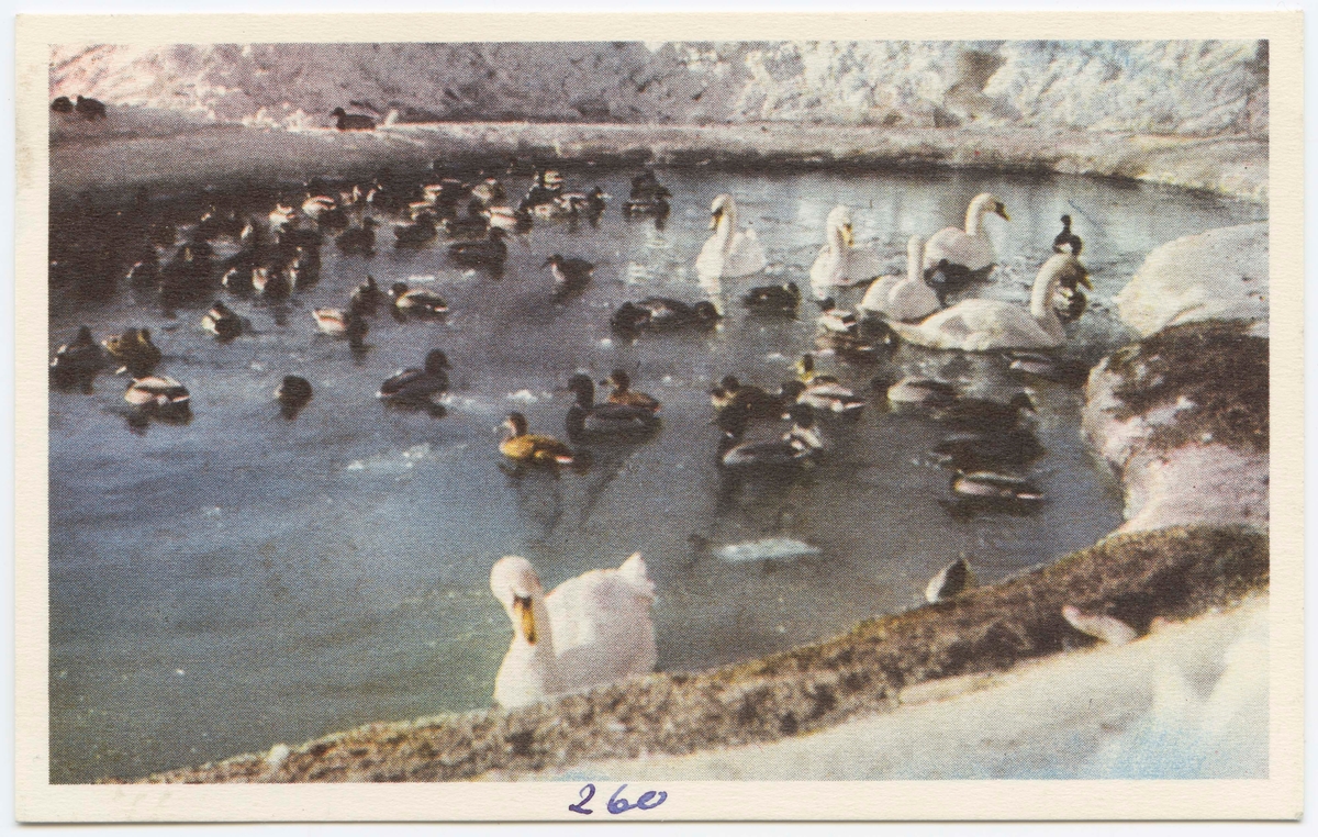 Titel: Vykort med motiv från Skansen. Svandammen på vintern.