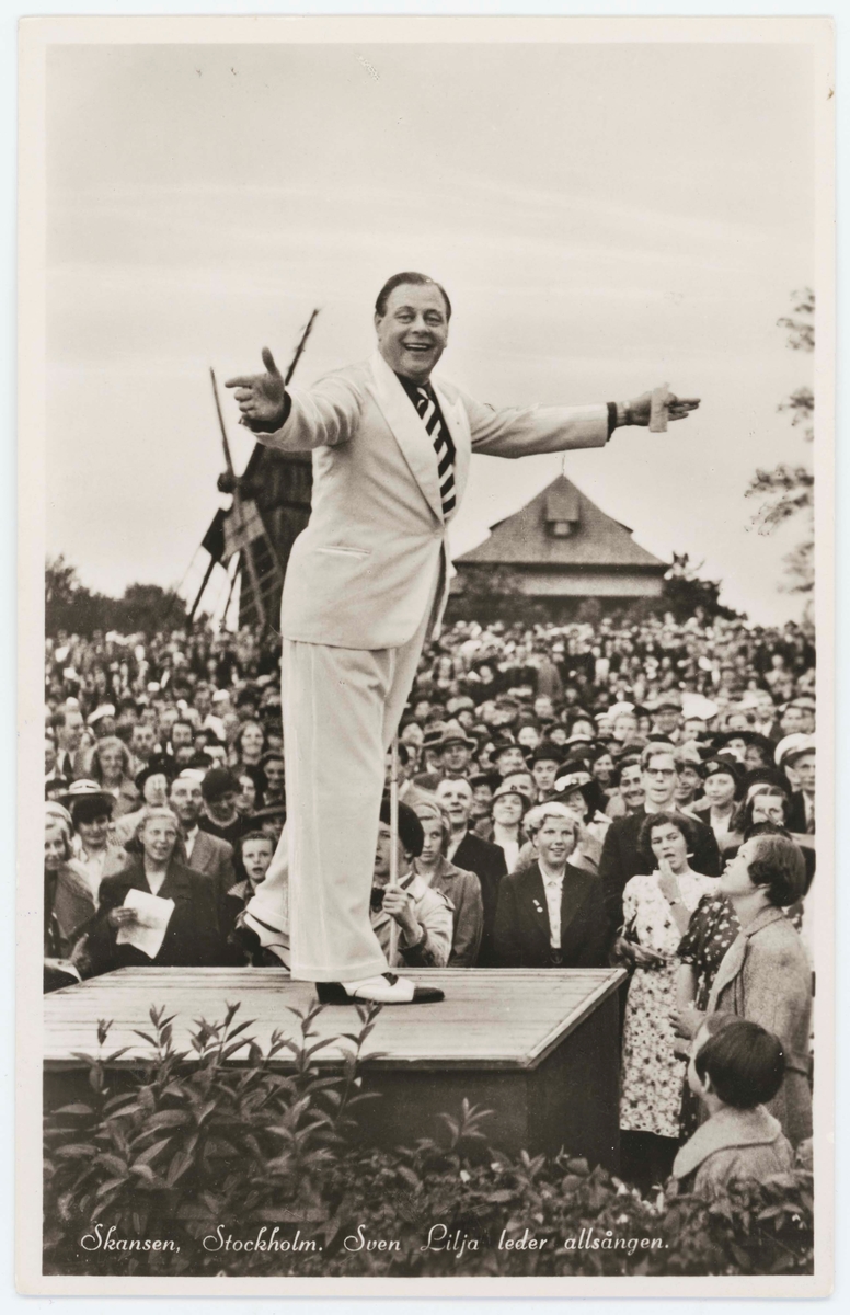 Titel: Vykort med motiv från Skansen. "Sven Lilja leder allsången"