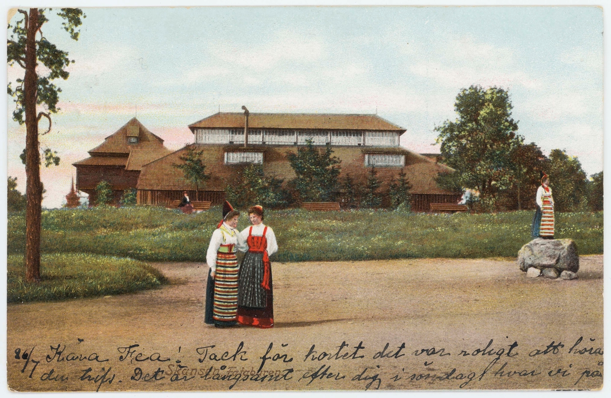 Vykort med motiv från Skansen. Tre folkdräktsklädda kvinnor utplacerade i miljön framför fågelhus (voljär) och Fatburen.