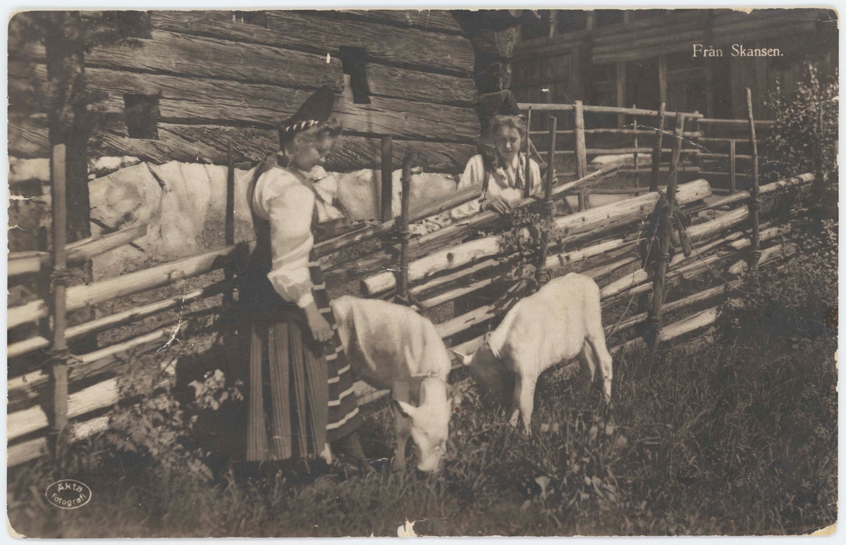 Titel: Vykort med motiv från Skansen. Två kvinnor i Rättviksdräkt med kalvar.