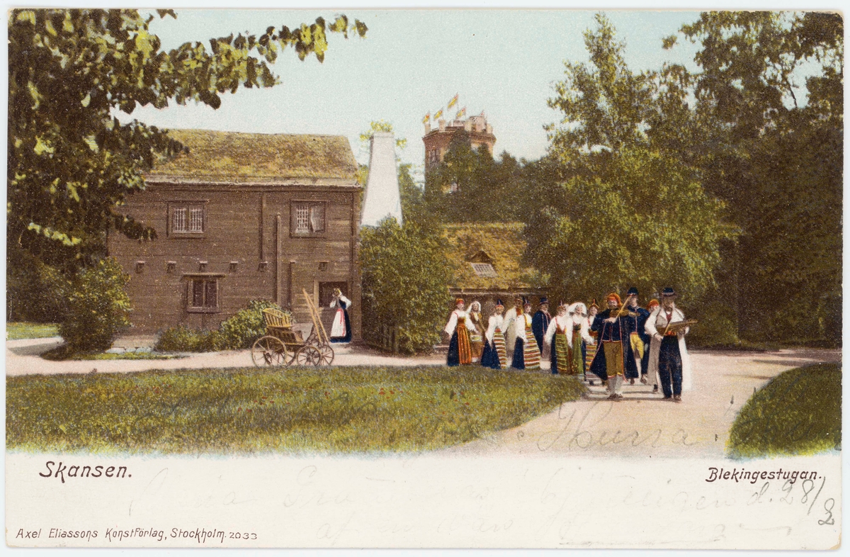 Titel: Vykort med motiv från Skansen. "Blekingstugan." Personer iklädda folkdräkt tågar efter spelmän.