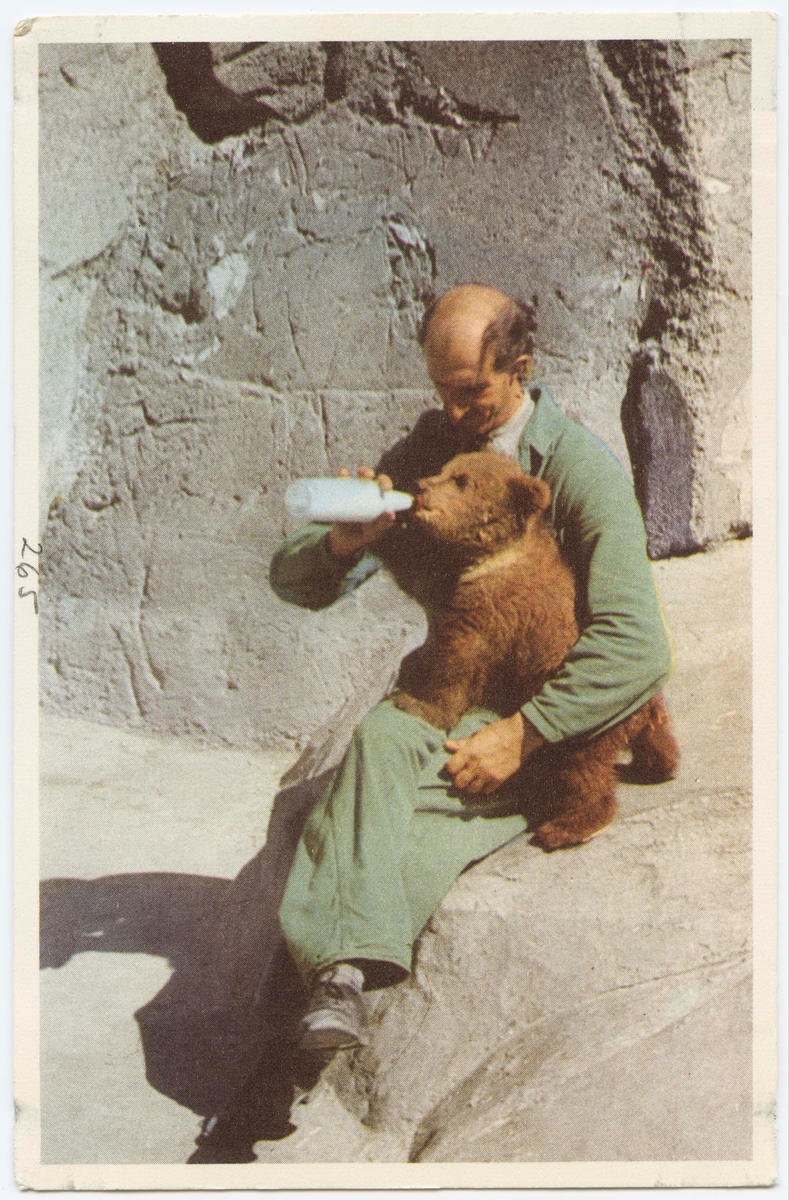 Titel: Vykort med motiv från Skansen. "Björnungen matas." Djurskötare matar brunbjörnsunge med nappflaska.