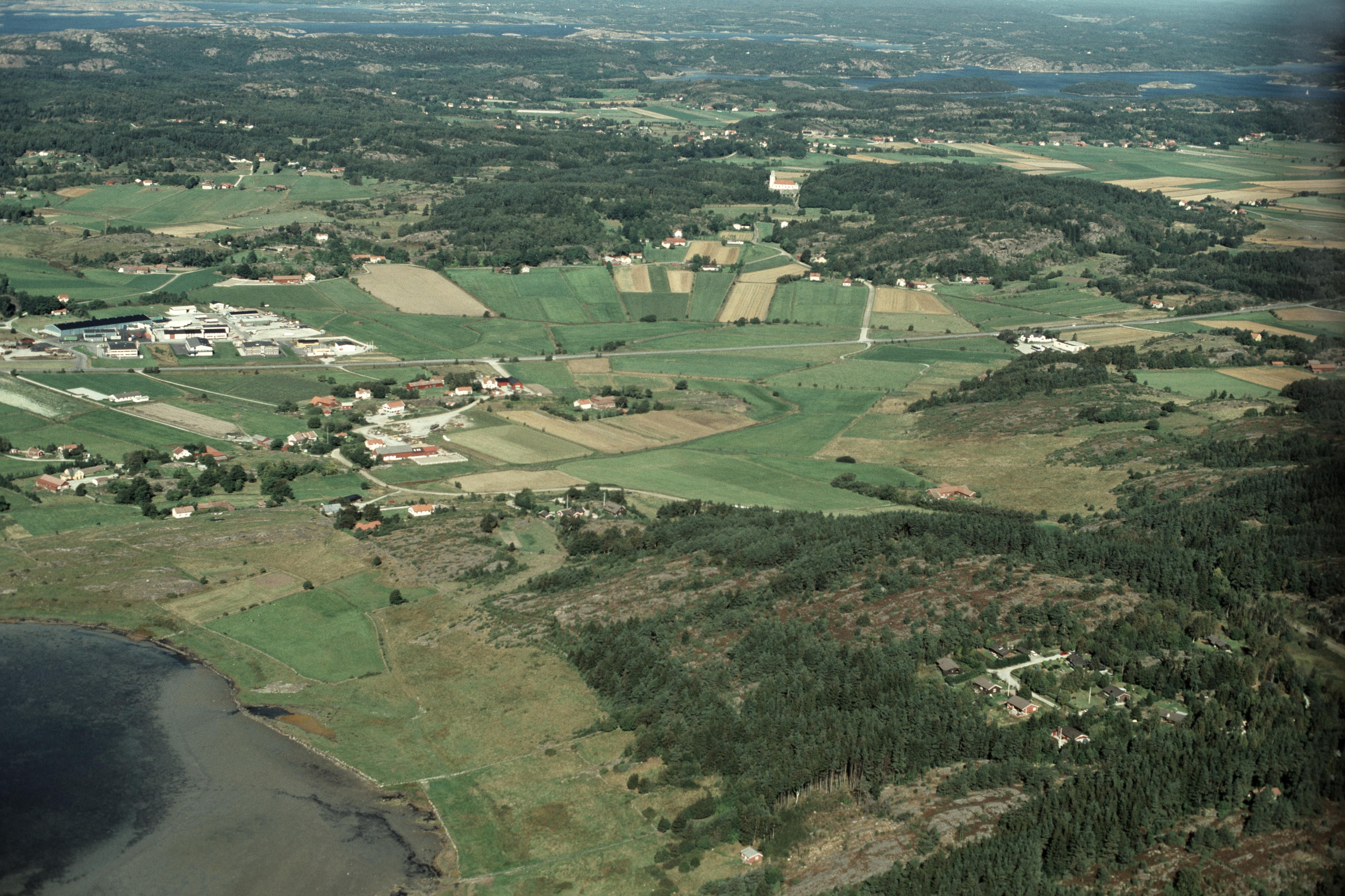 Havsviken Svanviks kile vid Svanvik och Röd på ön Tjörn, med bl.a. stensättning RAÄnr Valla 77:1 nere till höger. Valla kyrka i bildens övre del. Bilden är tagen mot (väderstreck): N