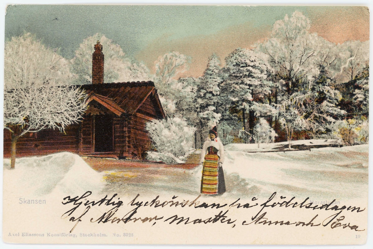 Vykort med motiv från Skansen. Morastugan, i förgrunden kvinna iklädd folkdräkt från Rättvik.