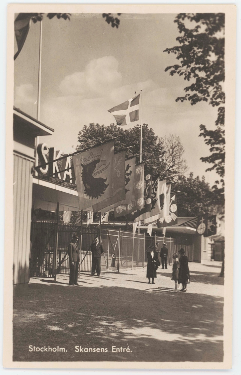 Titel: Vykort med motiv från Skansen. Skansens entré. Landskapsfanor.